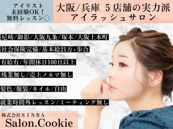 【尼崎・御影・塚本・大阪九条・大阪本町】全て駅近!《年間休日101日+有給休暇!社会保険完備!基本給20万円以上!向上心のある方を応援!インセンティブ、店販歩合等有》全6店舗で業務拡大の為、アイリスト募集★エリア最多メニュー数有のアイラッシュサロンです!