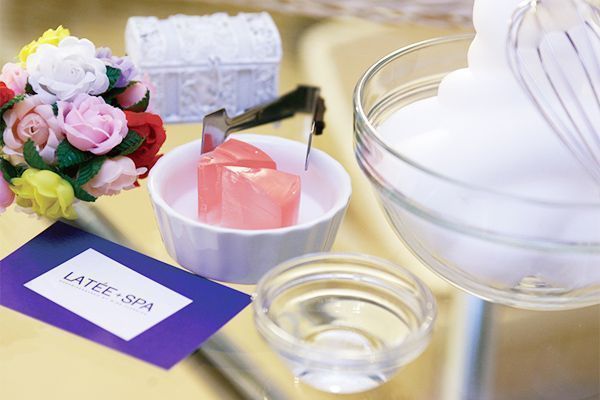 LATEE+SPA(ラテスパ)は『オゾン(マイナスイオン)のラテ(泡)で お肌についた汚れ(プラスイオン)を吸着させ、 美容液を主成分にした石鹸で洗い流す』メニューです。